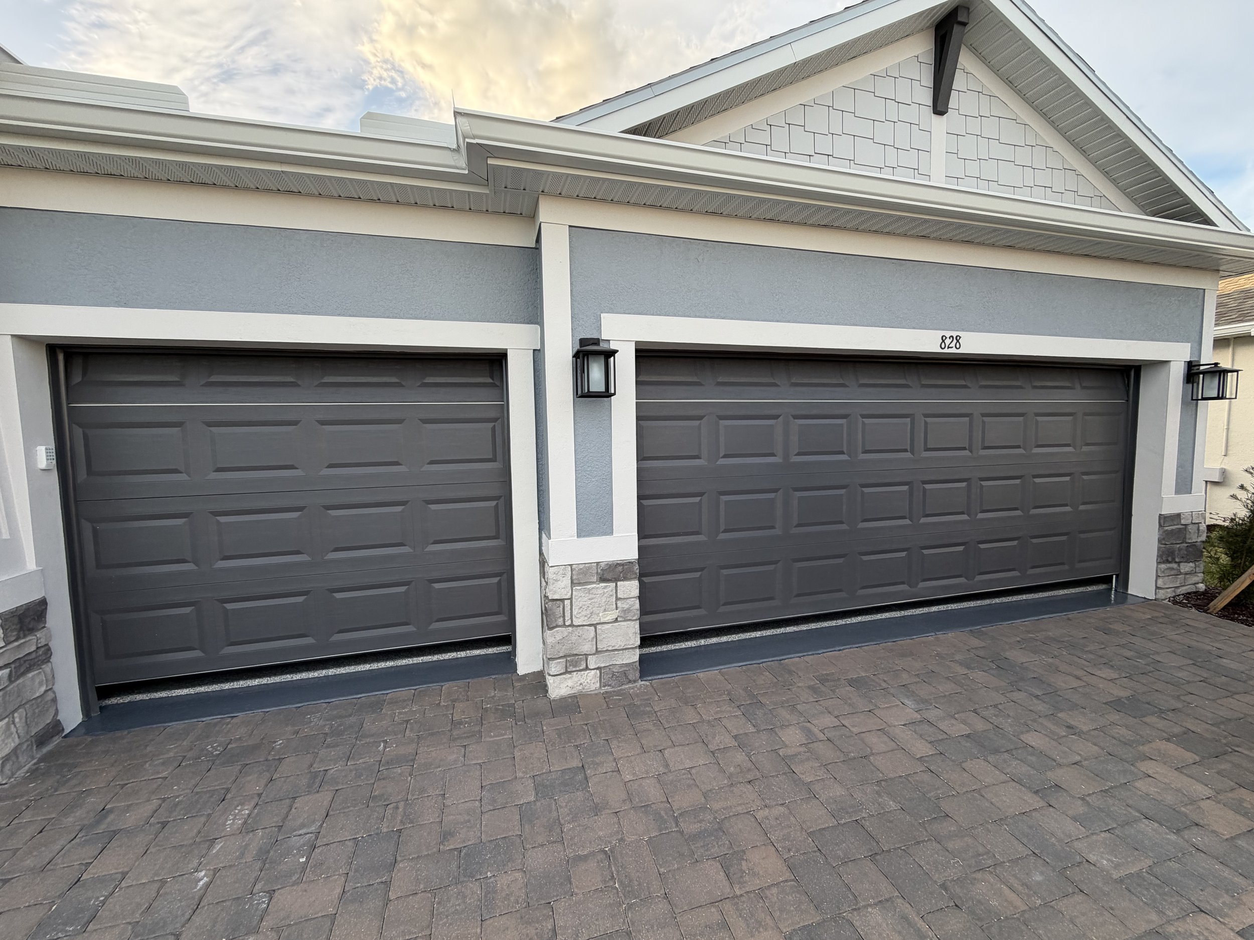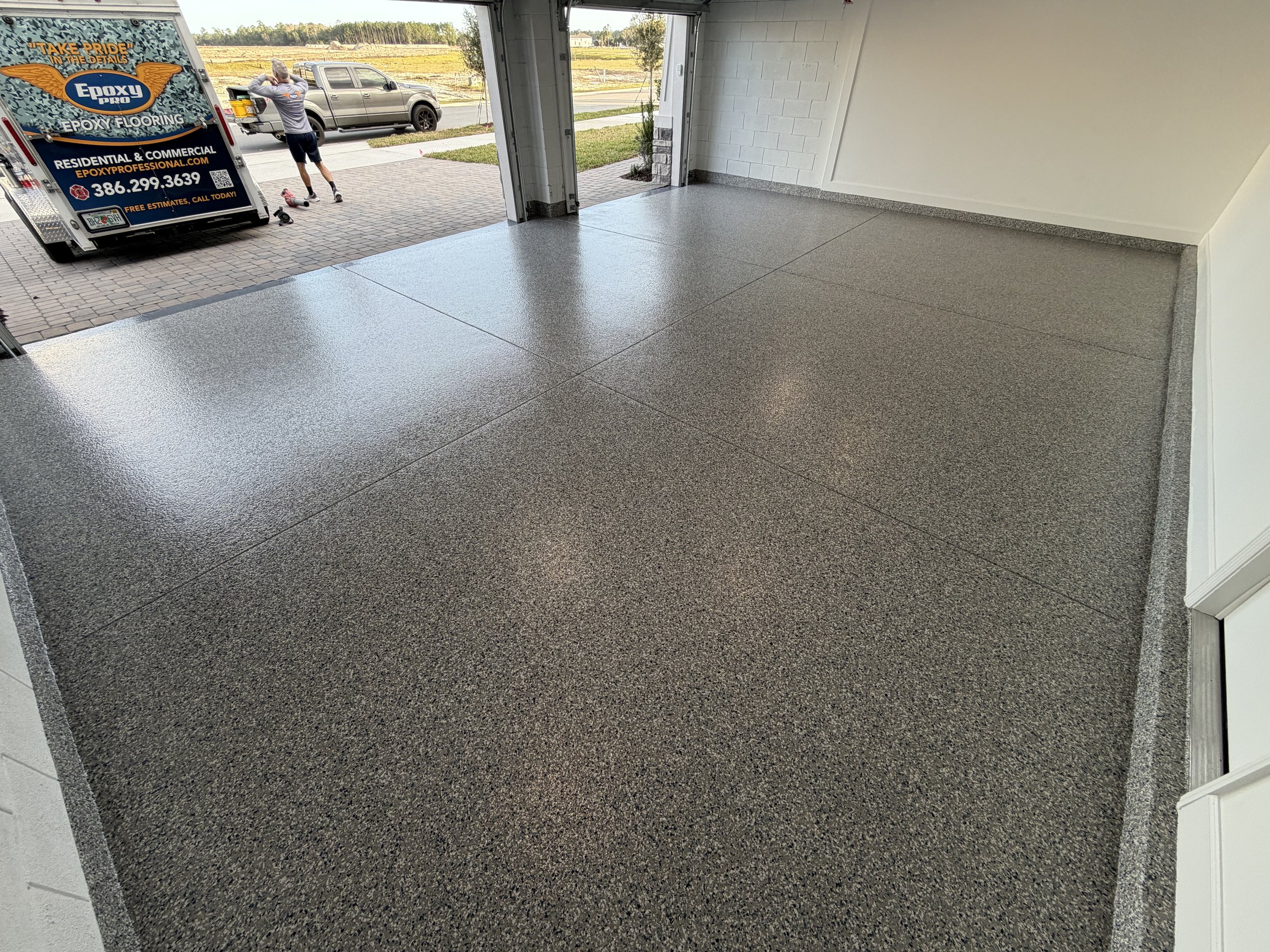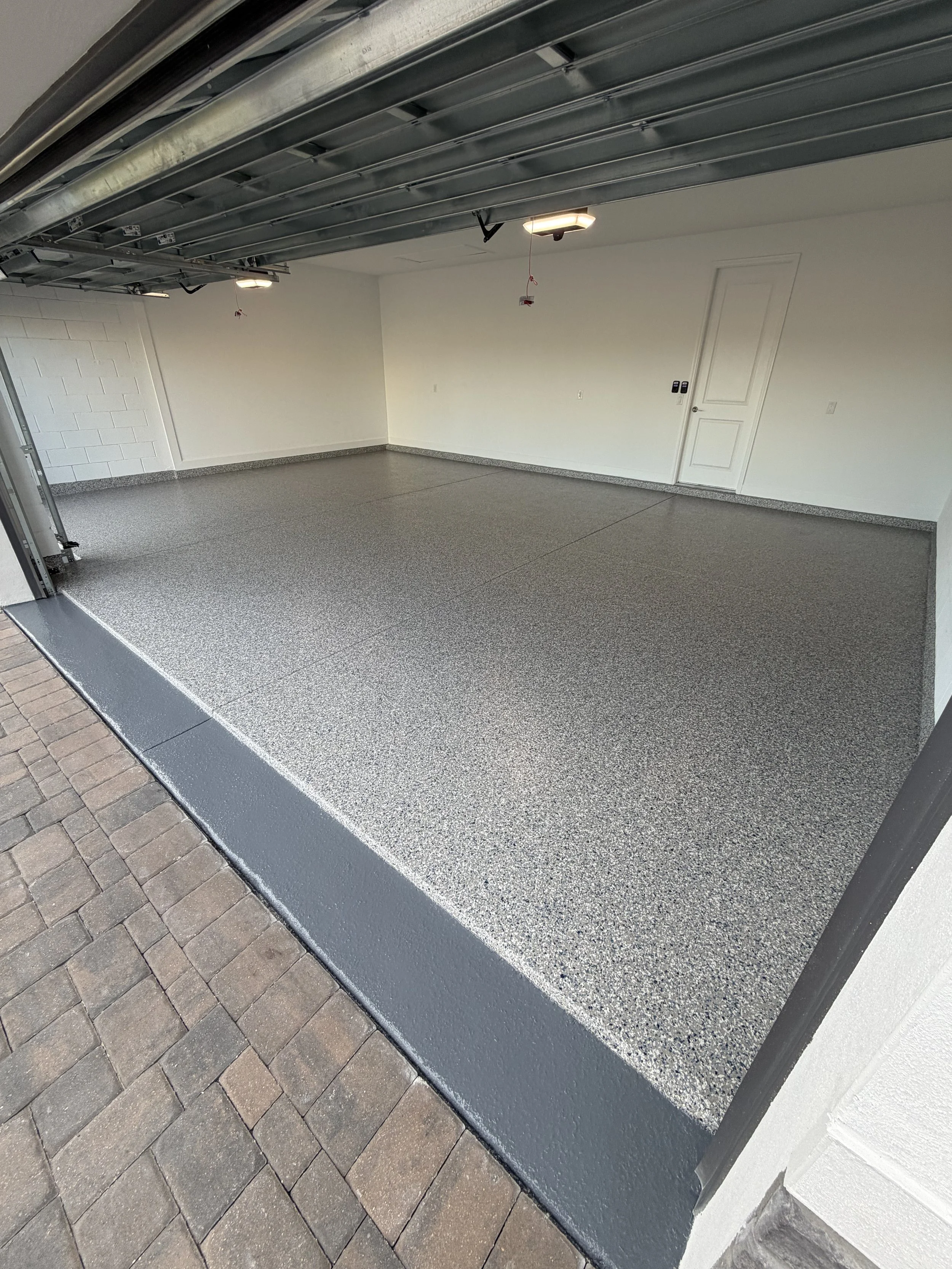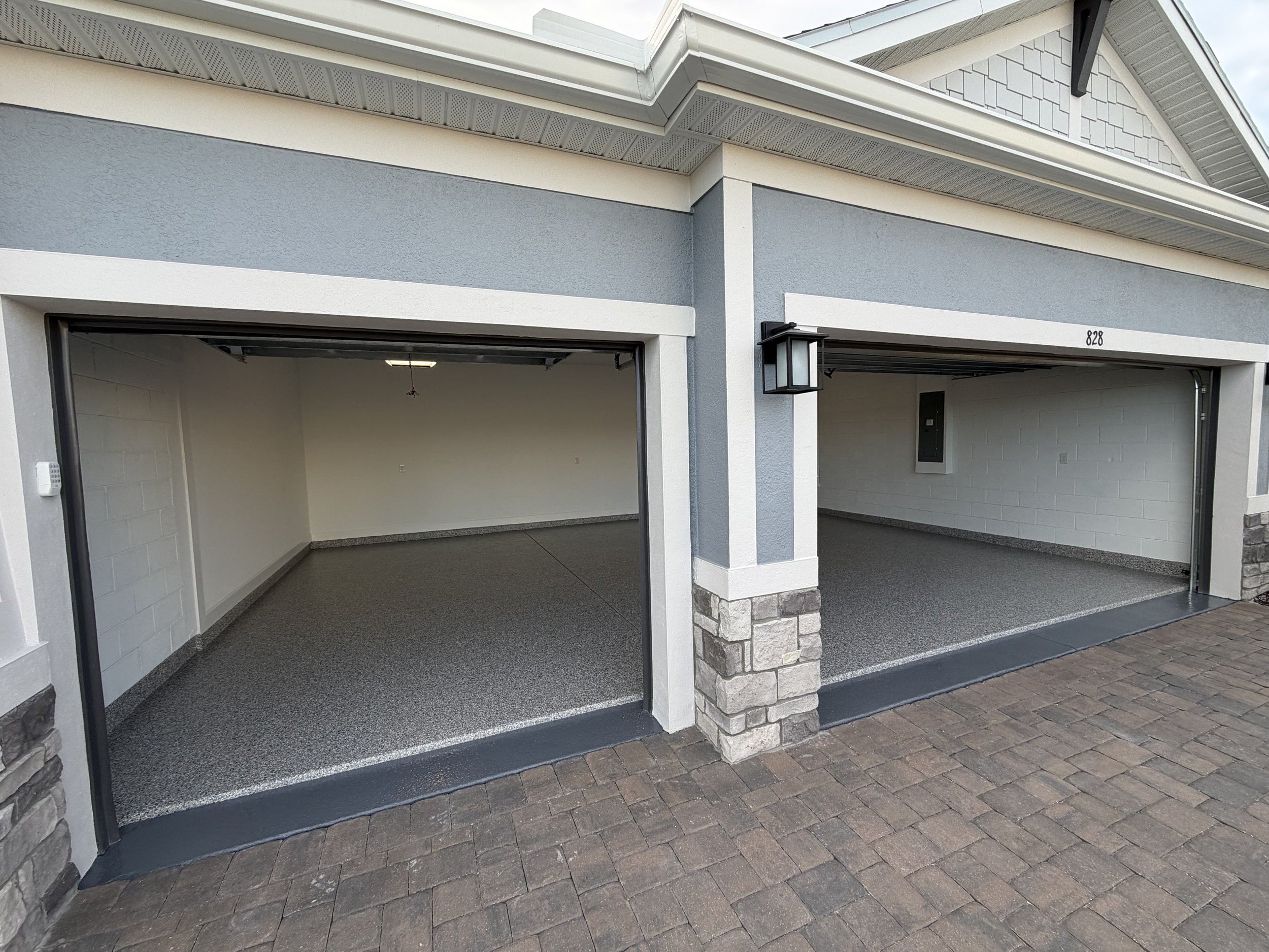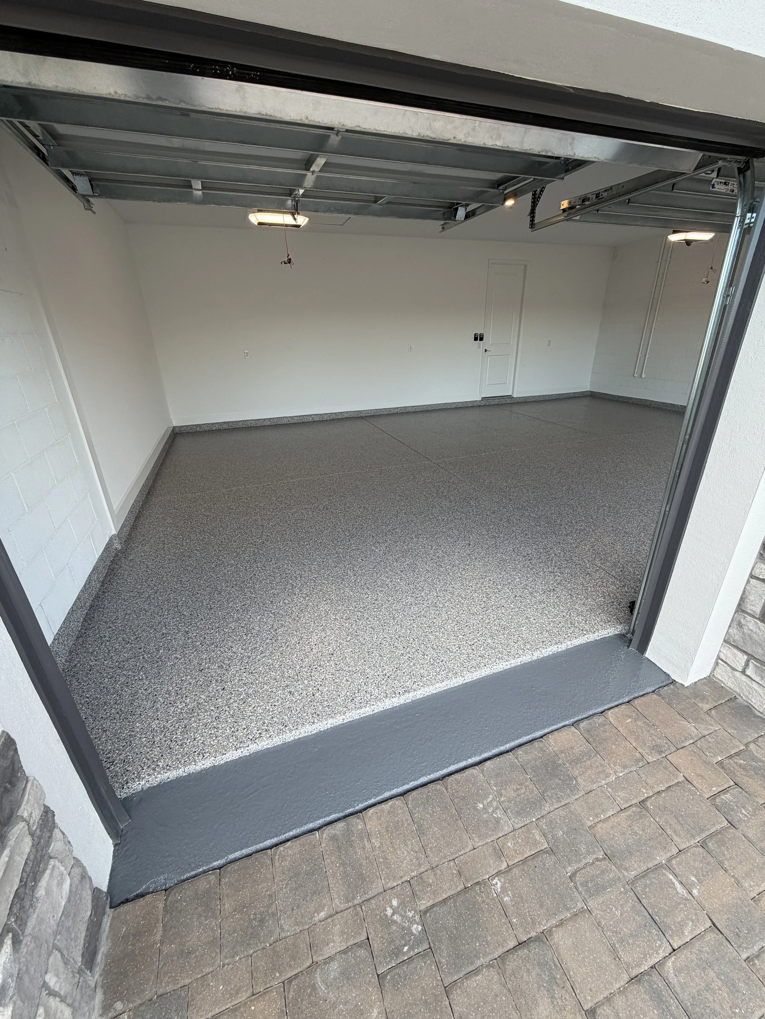 We took this ordinary garage and made it absolutely stunning! The boring ugly concrete did not fit with this beautiful new home. The homeowners chose a great color blend called Stonewash. It matches the exterior of the home perfectly. They also wanted a solid color front apron to give a unique look and transition. After our usual meticulous prep and installation it looks incredible! Let us help you level up your dream home with our beautiful and durable coatings.