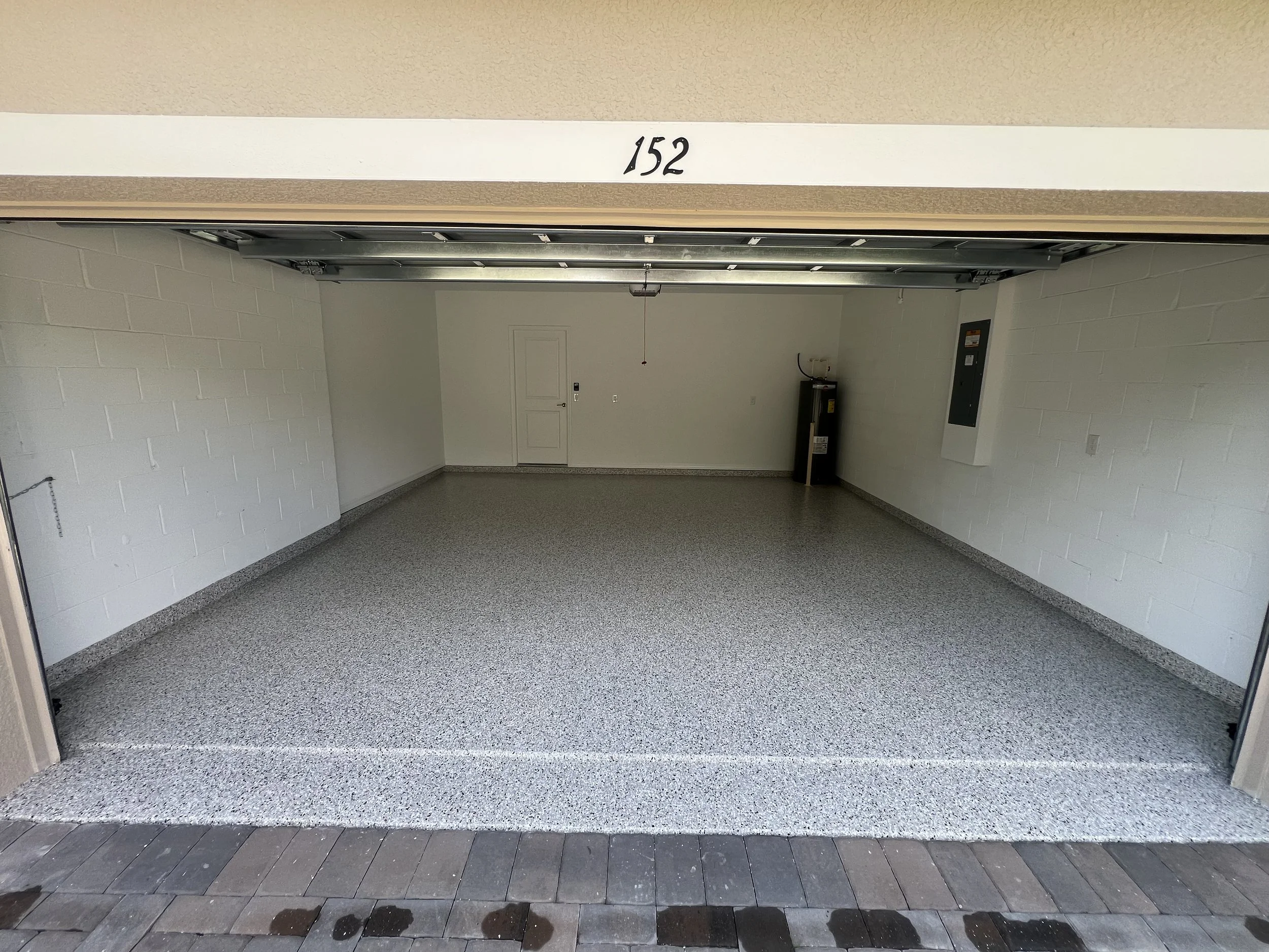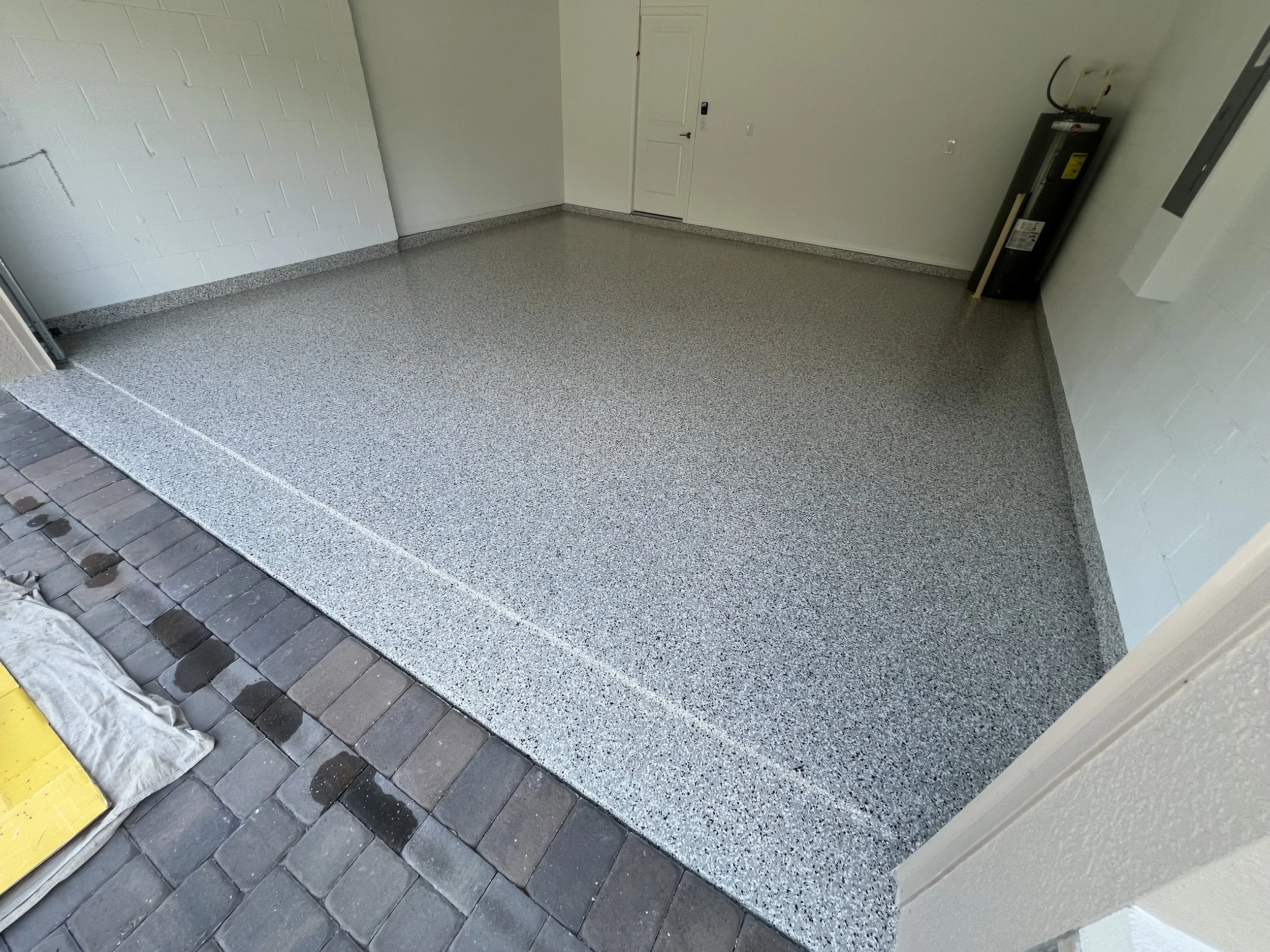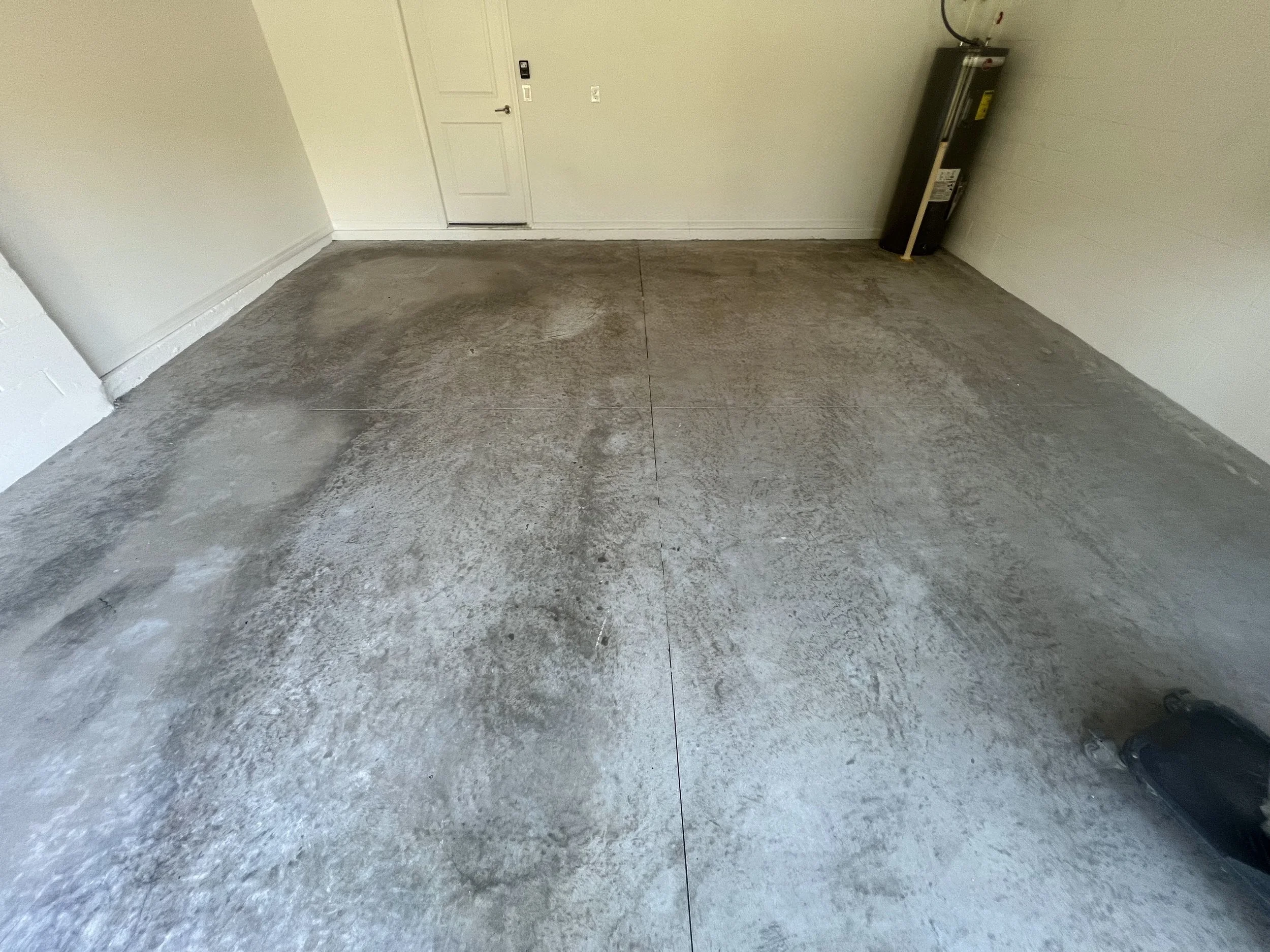 Even though this is a brand new build, the concrete is just not finished to be aesthetically pleasing. Protect your investment and add value by adding an epoxy coating. This will even be a selling point down the road! Look how much better this garage looks after receiving our beautiful Roll on Rock system. Night and Day difference! Color shown : Cabin Fever.