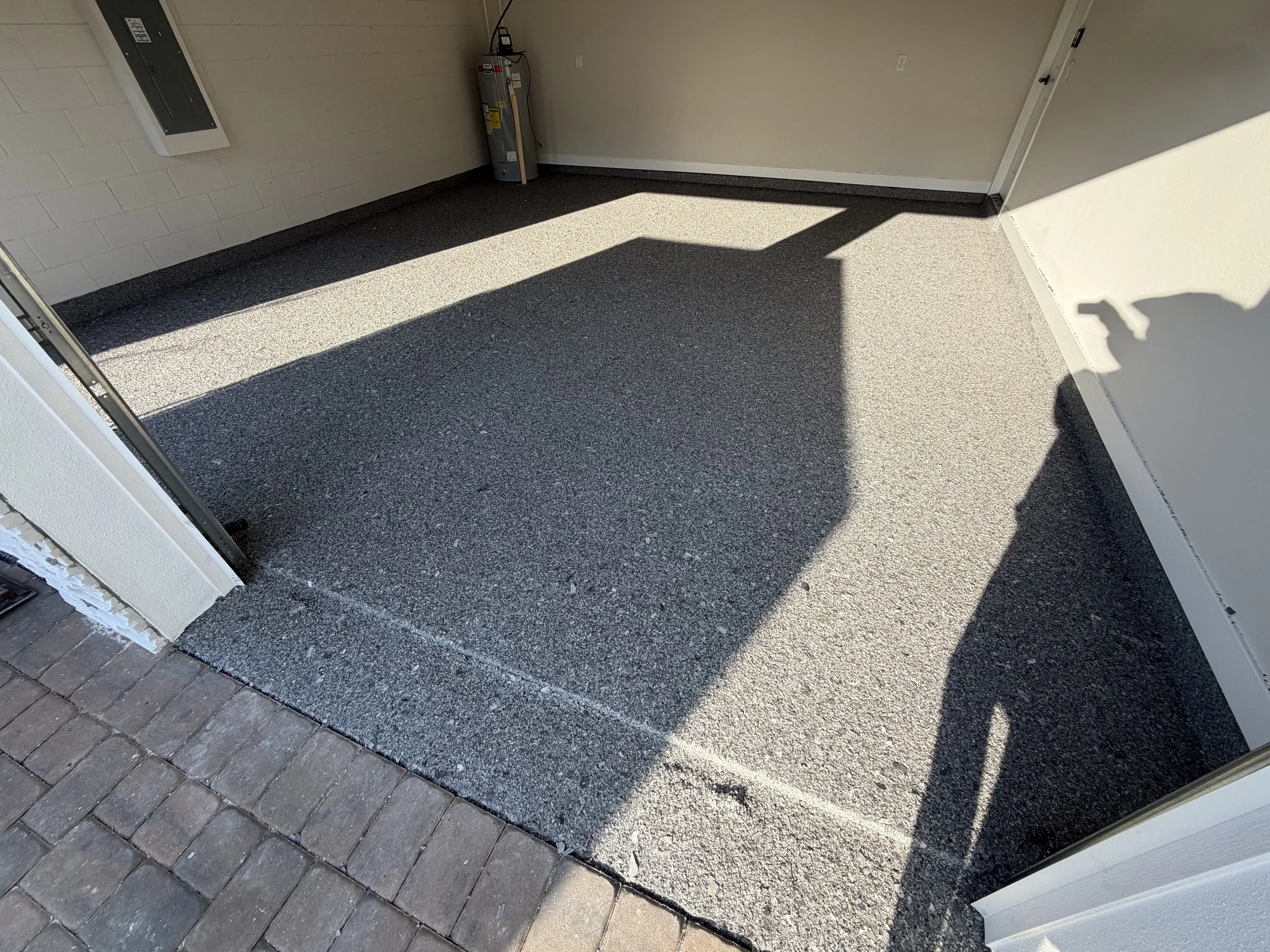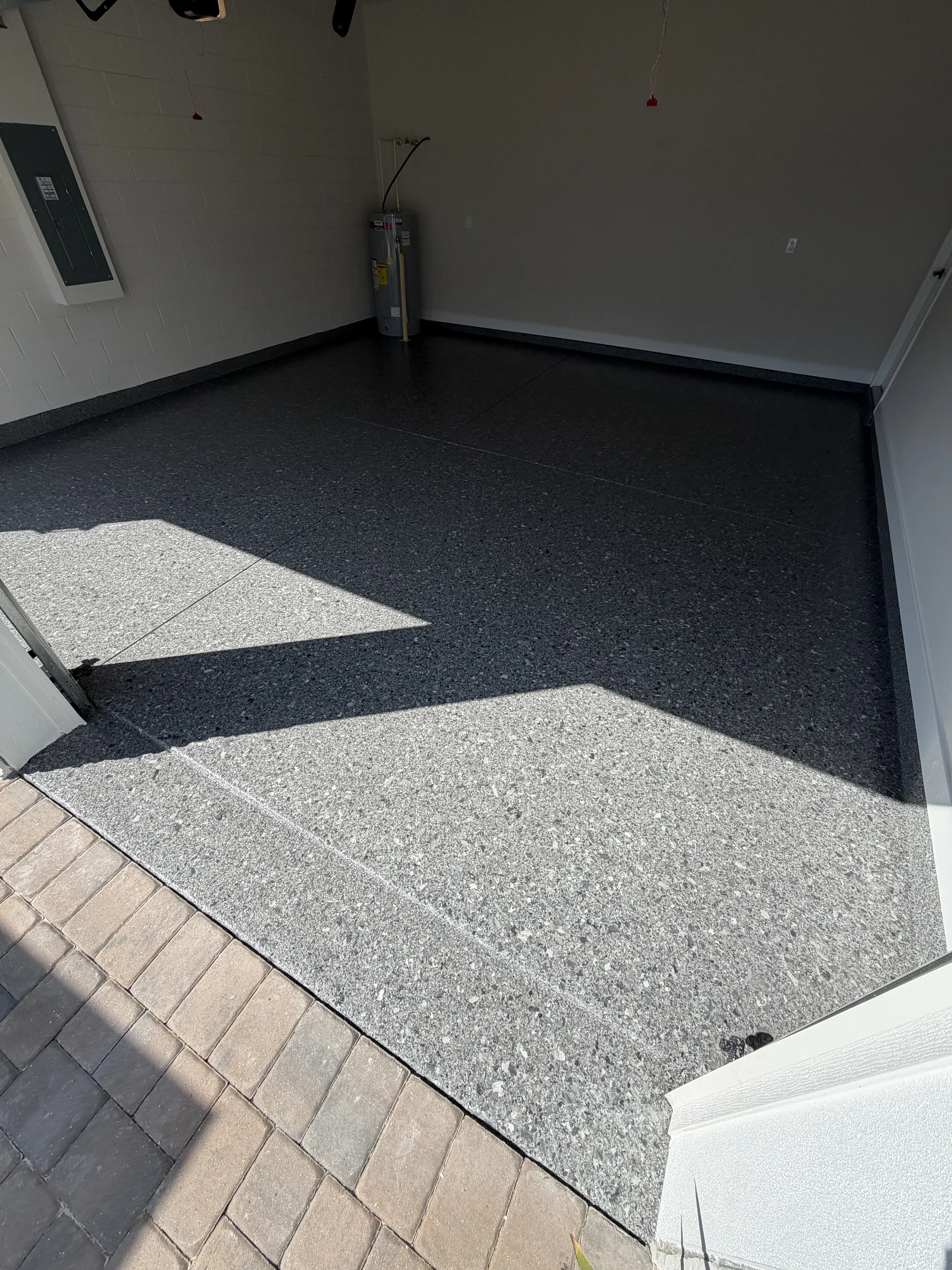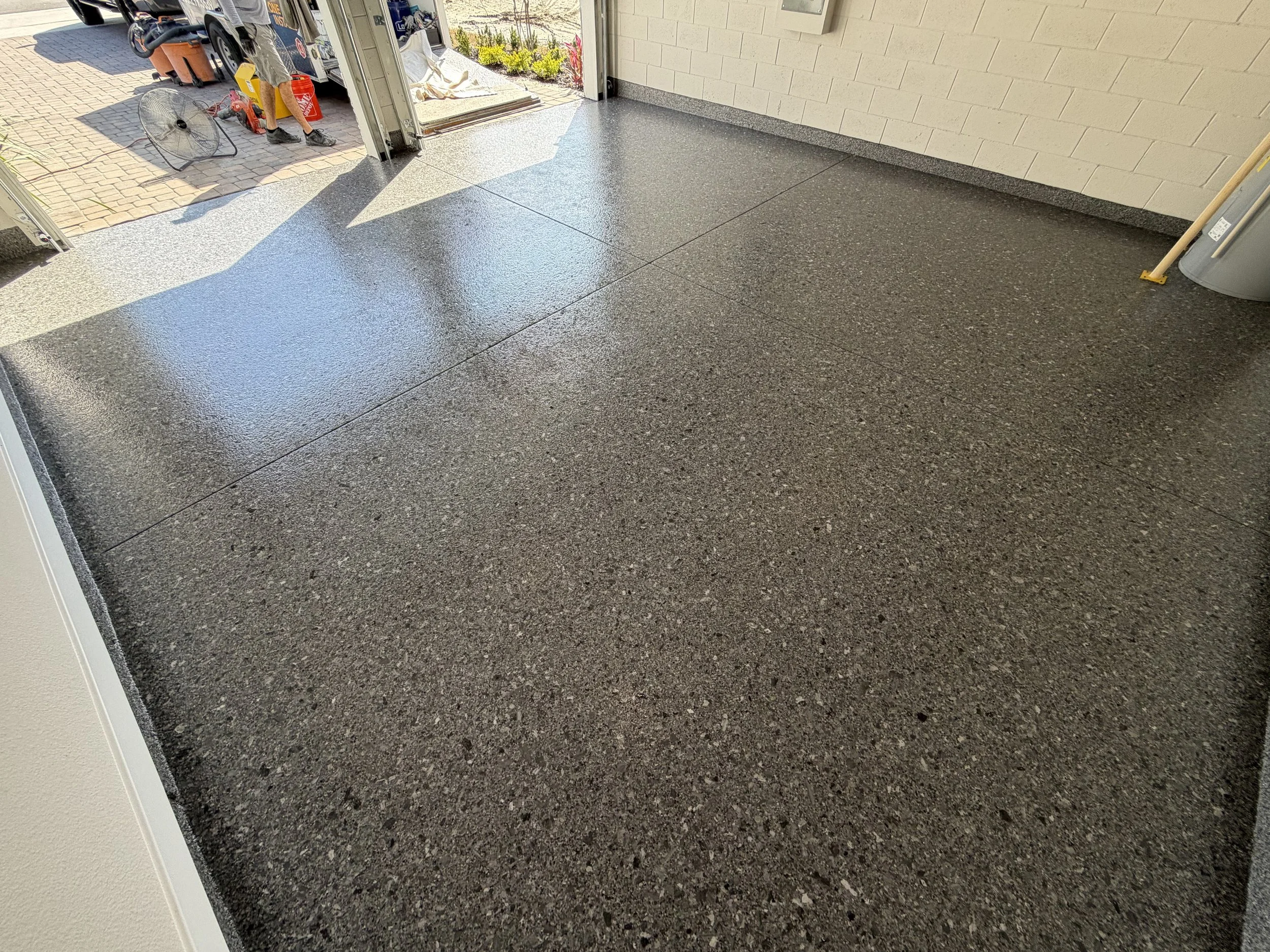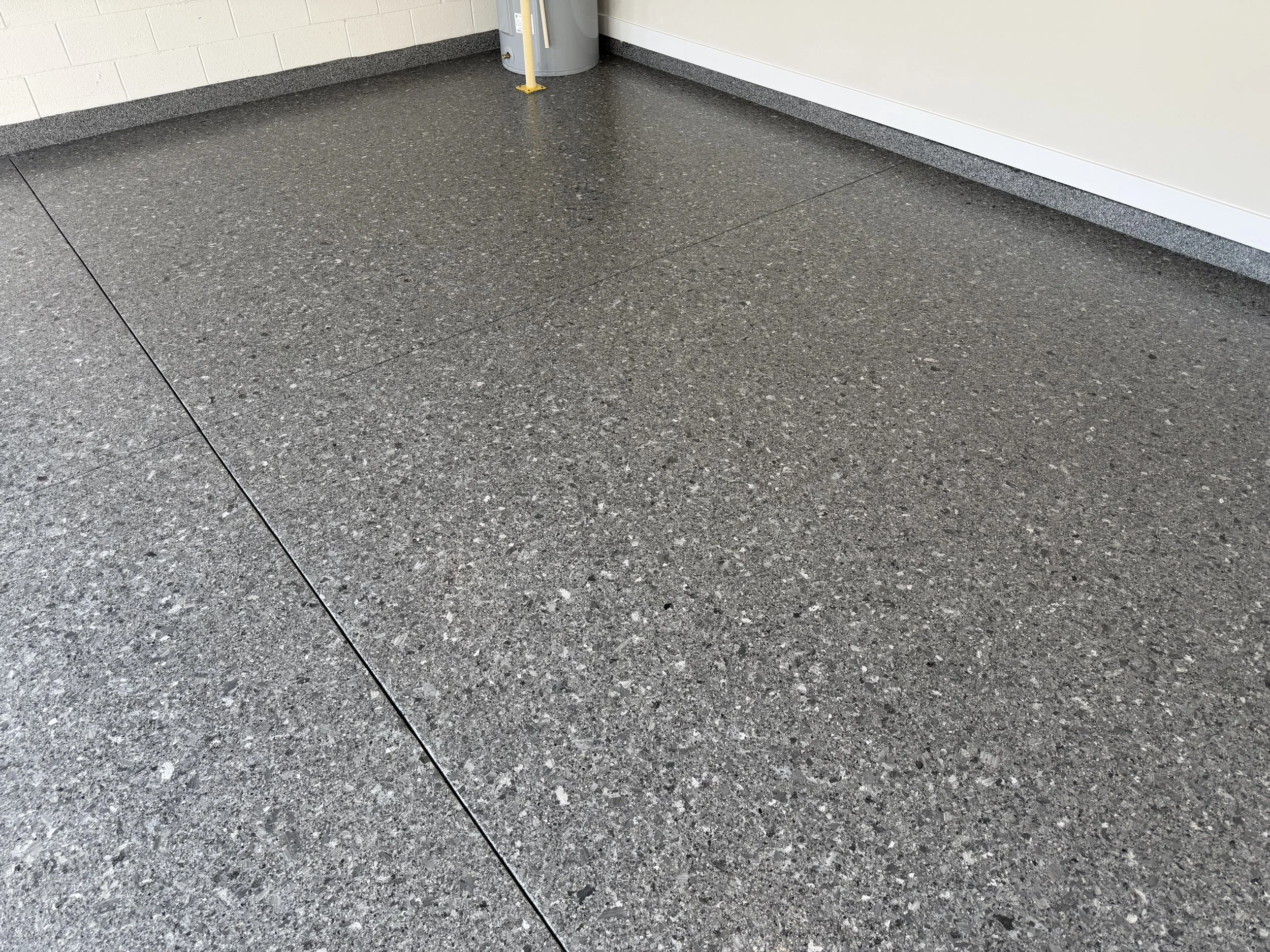 We were able to get this gorgeous coating done for our customer right after their closing so they didnβt have to worry about moving everything out of the garage to get a coating done! They chose our 1β Brindle style flake called Lanai Grey. Over our slate grey base coat this is one of my favorite finishes. Itβs a unique system that requires a bit more skill for installation to create uniform look. We first broadcast our 1β flake about 70/80% and then fill in the rest with the 1/4β flake. This creates a look that looks like a natural stone with different variations. It really finishes off the garage nicely!