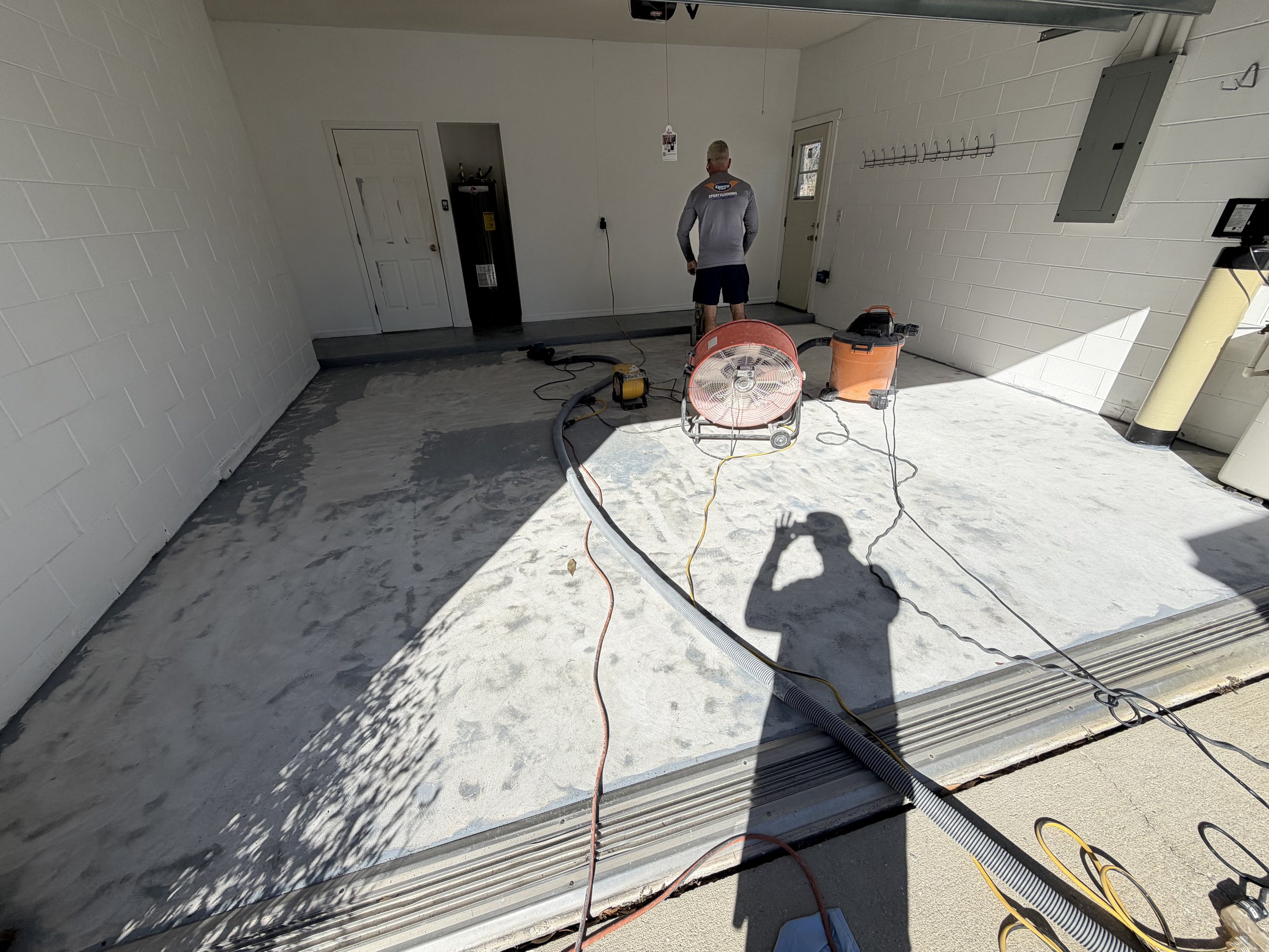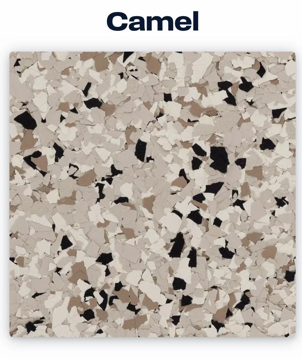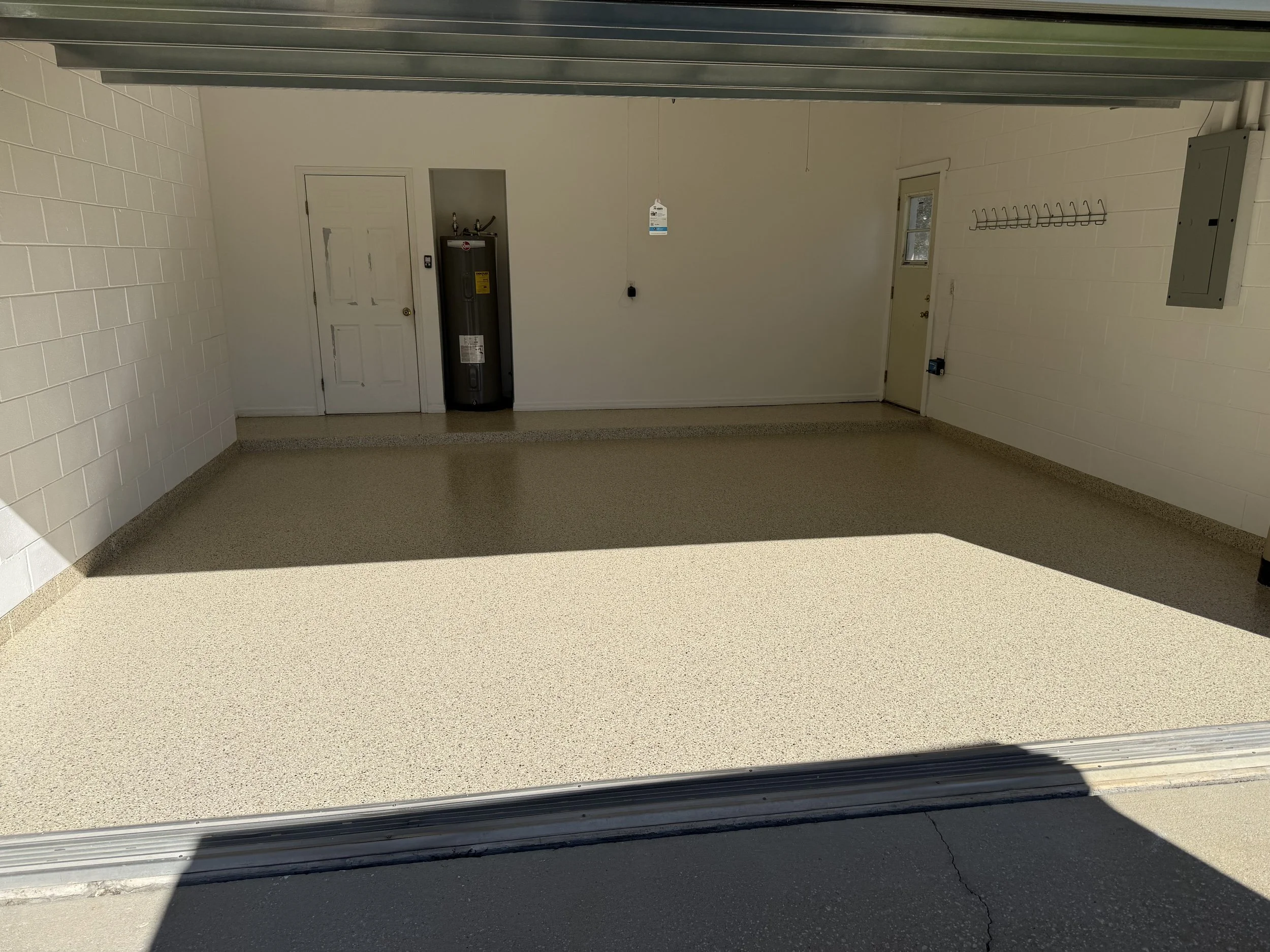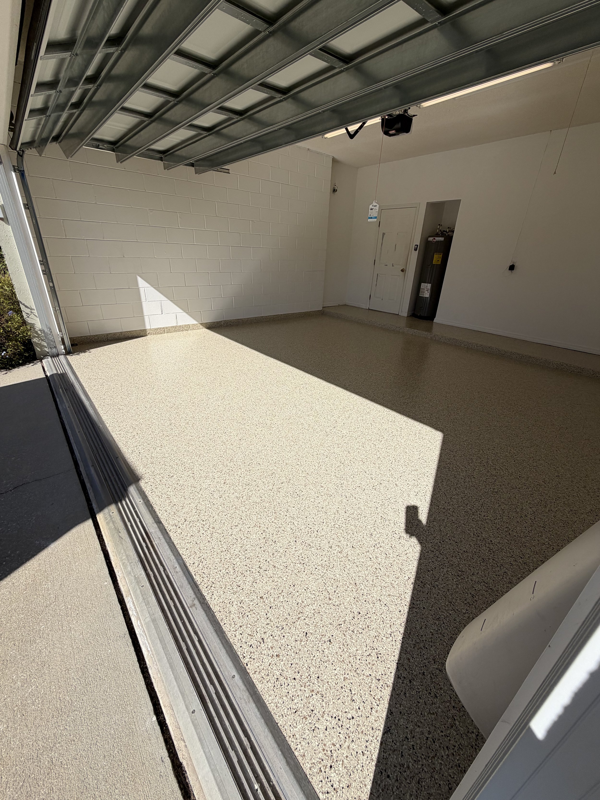 This customer was in a real sticky situation after their DIY kit from Home Depot did not fully cure. They needed it fixed so we came in to help! After removing the sticky top layer of uncured product we then diamond grinded the surface back to bare concrete. Once removed we repaired the surface and applied our Roll on Rocky system. Our customer chose 1/4” Camel Flake. Now the customer can get back to using their garage after the unfortunate setback. We are very competitive and fair in our pricing so if you have an issue give us a call! We have extensive knowledge and even if you think you are doomed we can always help find a solution!